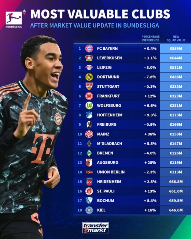 德甲球隊(duì)德轉(zhuǎn)身價(jià)排名(括號(hào)內(nèi)為更新后身價(jià)變化幅度):