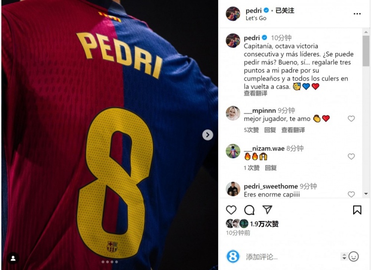 全場最佳!佩德里社媒:擔任隊長+西甲8連勝,三分獻給巴薩球迷