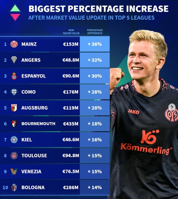 五大聯(lián)賽球隊(duì)身價(jià)升值比例最高榜:歐元