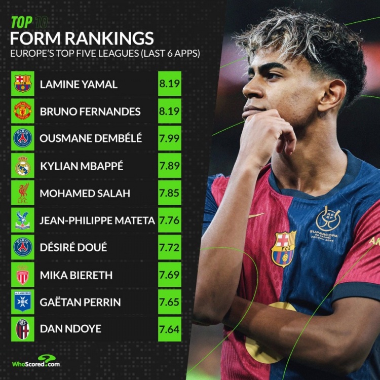 3月28日訊 國家隊比賽周已經(jīng)結束,whoscored統(tǒng)計了五大聯(lián)賽此前6輪的場均評分情況,亞馬爾和B費并列居首。