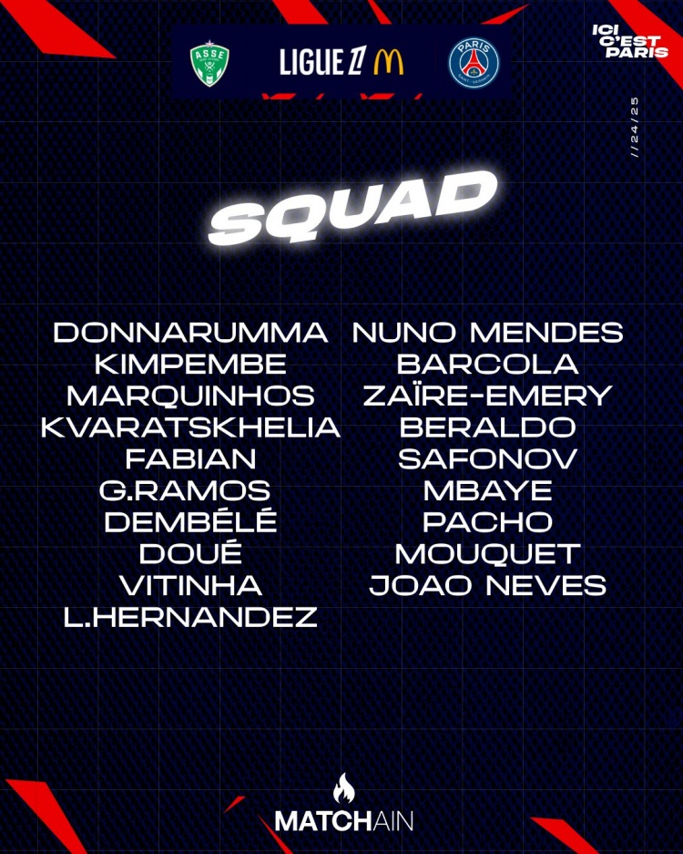 3月29日訊 北京時間明天凌晨2點,巴黎將在法甲第27輪比賽中客場對陣圣埃蒂安,巴黎公布了此役的球員名單,登貝萊、杜埃、克瓦拉茨赫利亞在列,阿什拉夫、李剛?cè)省ⅠR尤盧缺席。