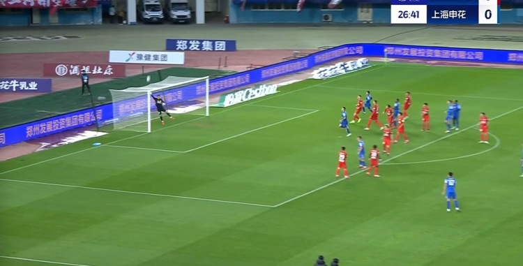 第27分鐘,申花前場左側(cè)定位球機(jī)會,高天意主罰,皮球直奔十分角,最終擊中門框彈出底線↓