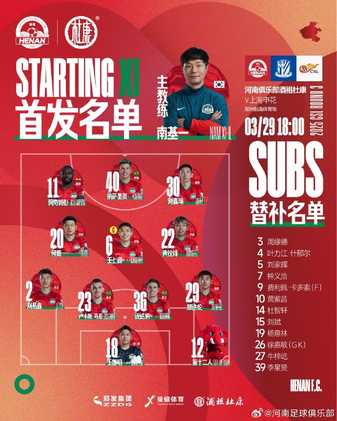 河南俱樂部酒祖杜康VS上海申花 首發(fā)及替補(bǔ)隊(duì)員名單