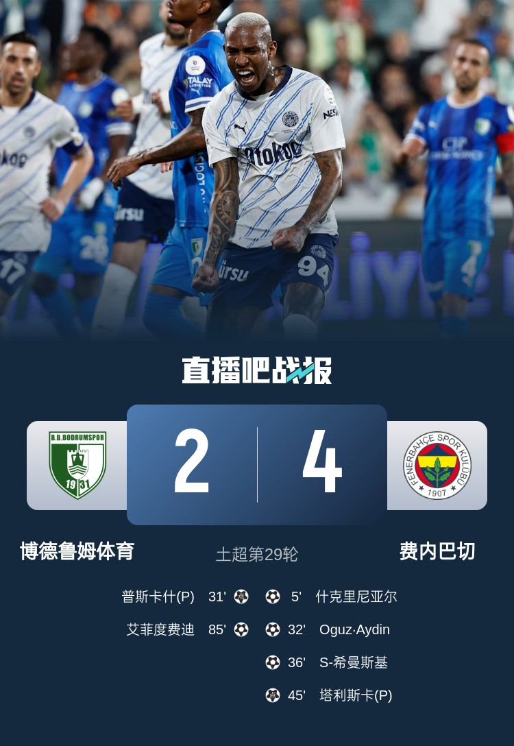 13輪不??!費(fèi)內(nèi)巴切4-2博德魯姆體育距榜首6分 塔利斯卡點(diǎn)射+送點(diǎn)
