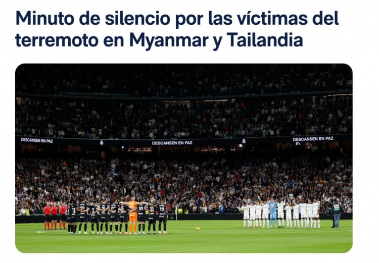皇馬官網(wǎng)寫道:圣地亞哥-伯納烏球場(chǎng)在皇家馬德里與萊加內(nèi)斯的比賽開始前默哀一分鐘,悼念緬甸和泰國(guó)地震中的數(shù)千名遇難者。兩隊(duì)球員都佩戴了袖標(biāo)。