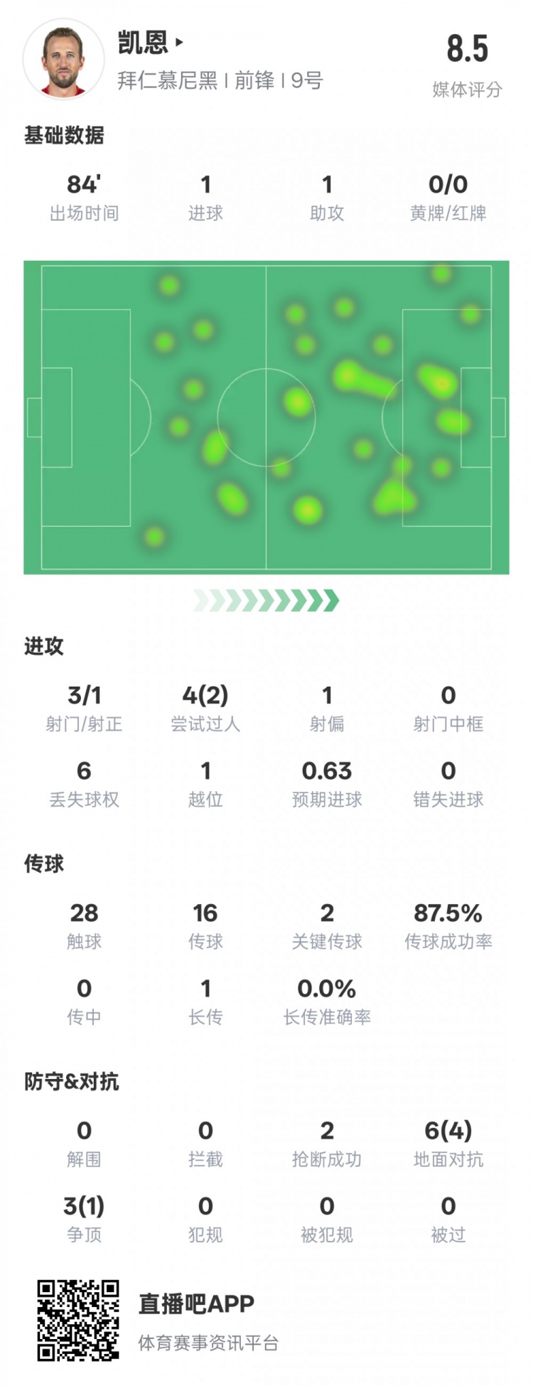 凱恩本場(chǎng)數(shù)據(jù):傳射建功&2關(guān)鍵傳球2過人成功,評(píng)分8.5