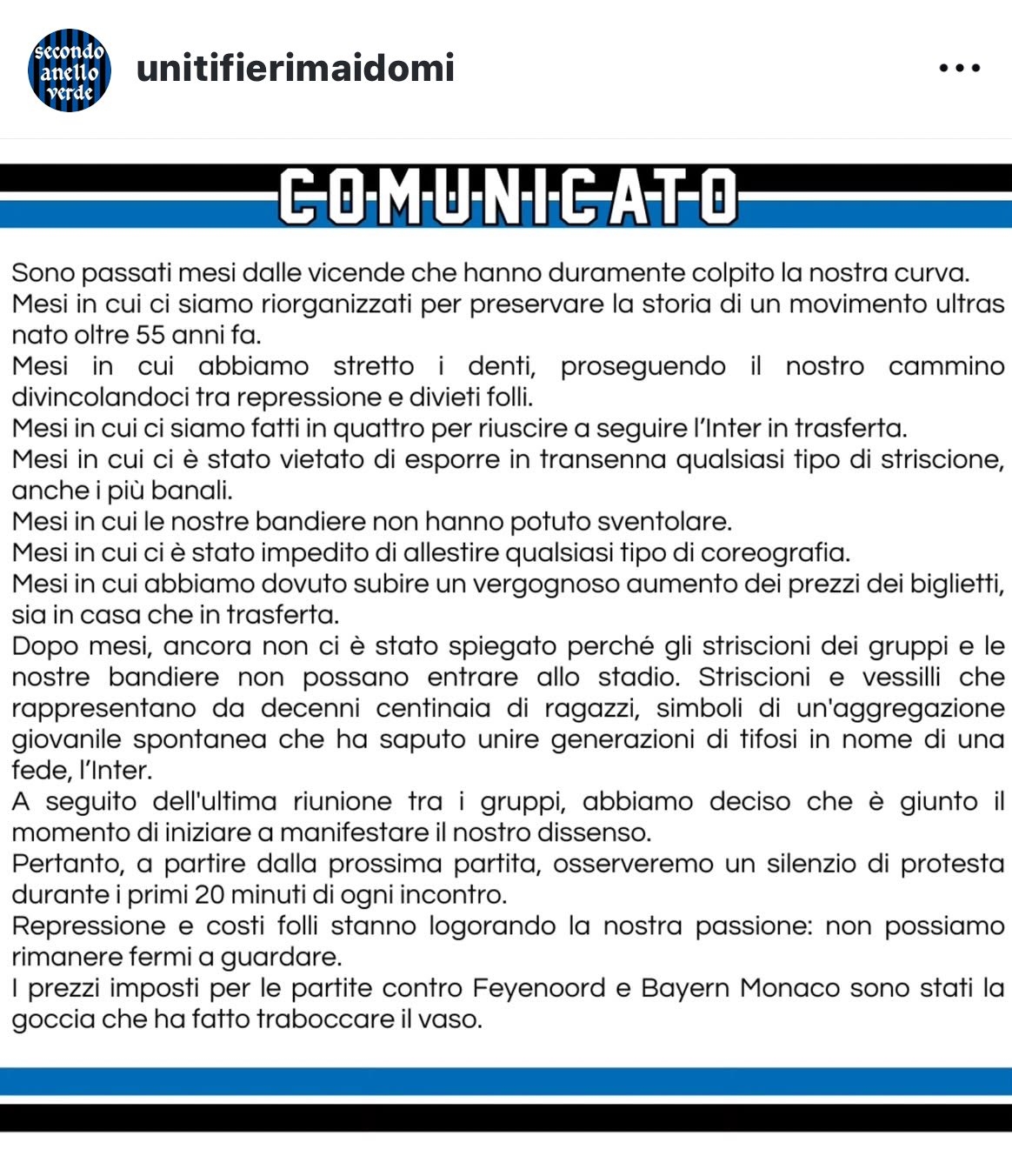 3月30日訊 國米北看臺球迷組織發(fā)布公告,宣布在之后每場比賽的前20分鐘保持沉默,抗議票價(jià)過高、主場禁止攜帶標(biāo)語等情況。