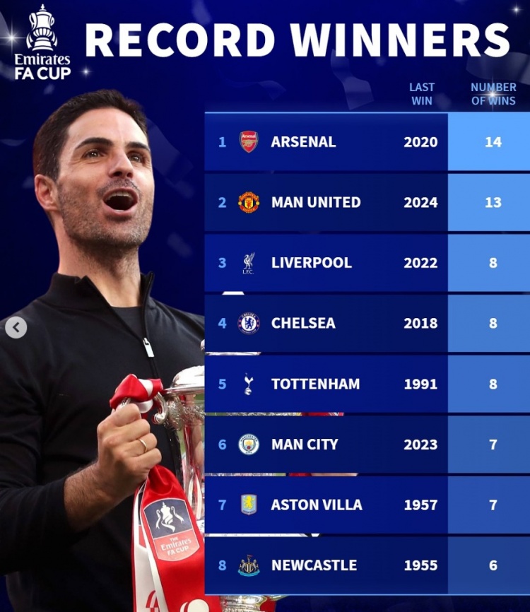 3月30日訊 足總杯八強(qiáng)戰(zhàn)將在本周末戰(zhàn)火重燃,《轉(zhuǎn)會(huì)市場(chǎng)》也統(tǒng)計(jì)了足總杯歷史奪冠榜,阿森納力壓曼聯(lián)居首。