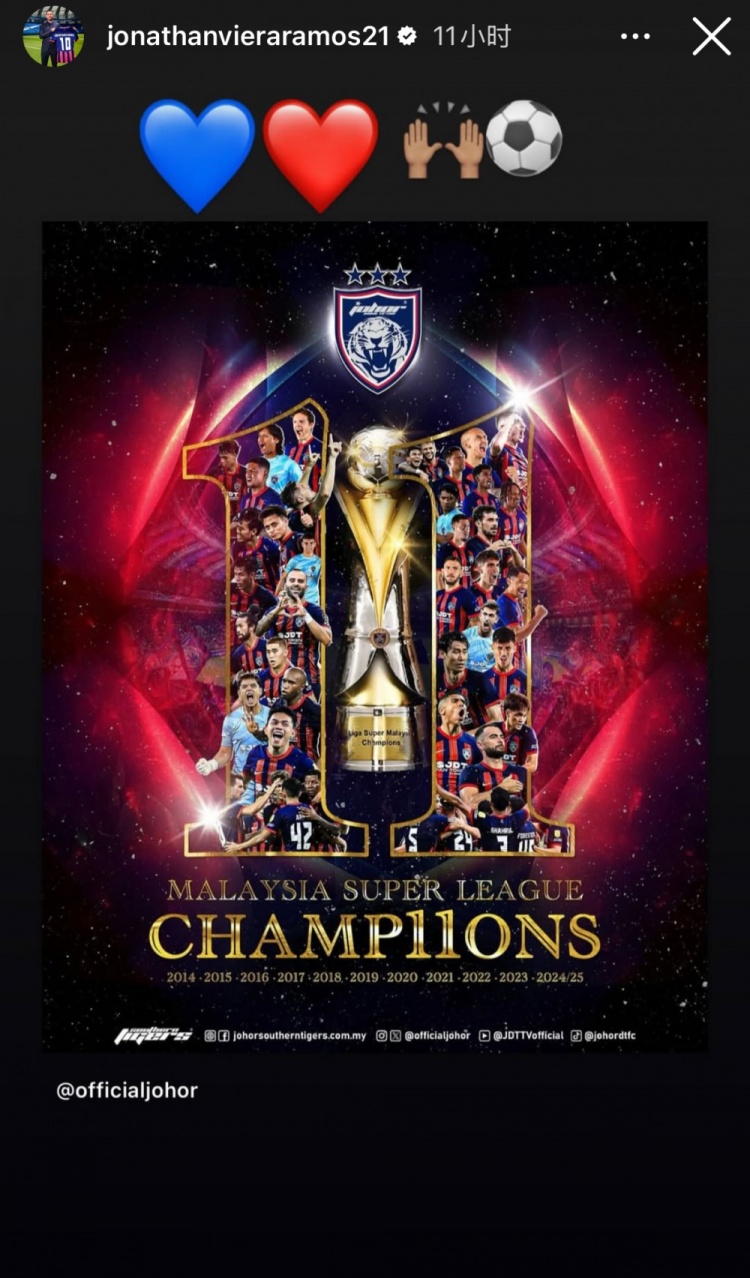 24日進(jìn)行的馬來西亞超級聯(lián)賽第22輪比賽,柔佛新山主場2-0擊敗霹靂,提前4輪問鼎本賽季冠軍。賽后,比埃拉曬出了奪冠的海報(bào),并附上了多個表情慶祝柔佛新山提前奪冠。