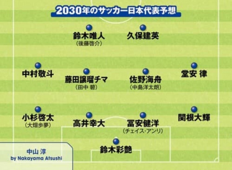 3月30日訊 據(jù)日媒Sportiva報(bào)道,近日該媒體開(kāi)設(shè)專(zhuān)欄,開(kāi)始對(duì)2030年世界杯日本隊(duì)首發(fā)陣容預(yù)測(cè),有部分日本國(guó)內(nèi)的自由撰稿人投稿對(duì)首發(fā)進(jìn)行預(yù)測(cè)。以上撰稿人預(yù)測(cè)的陣容中,基本都是本期日本國(guó)家隊(duì)陣中的年輕球員,并結(jié)合部分現(xiàn)役U22國(guó)家隊(duì)、U20國(guó)家隊(duì)球員等組合而成。