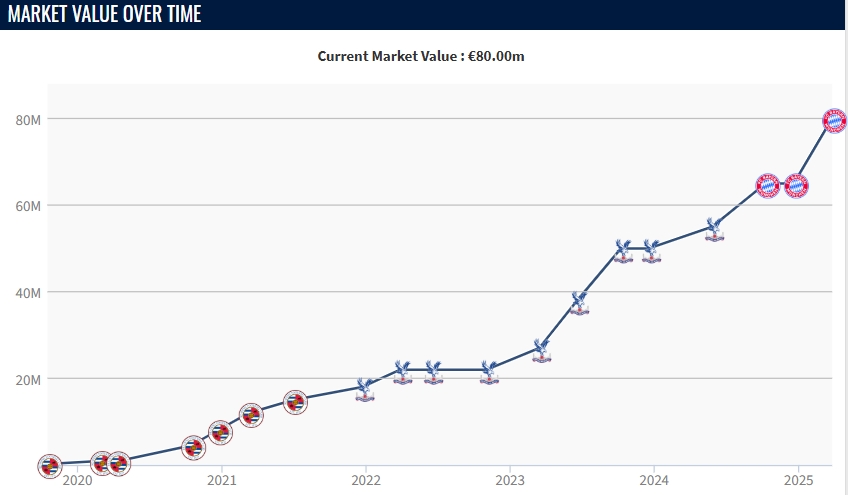 2024年夏窗,拜仁花費5300萬歐元從水晶宮簽下奧利塞,合同簽至2029年6月。本賽季奧利塞代表拜仁出戰(zhàn)41場比賽,貢獻13粒進球和13次助攻。