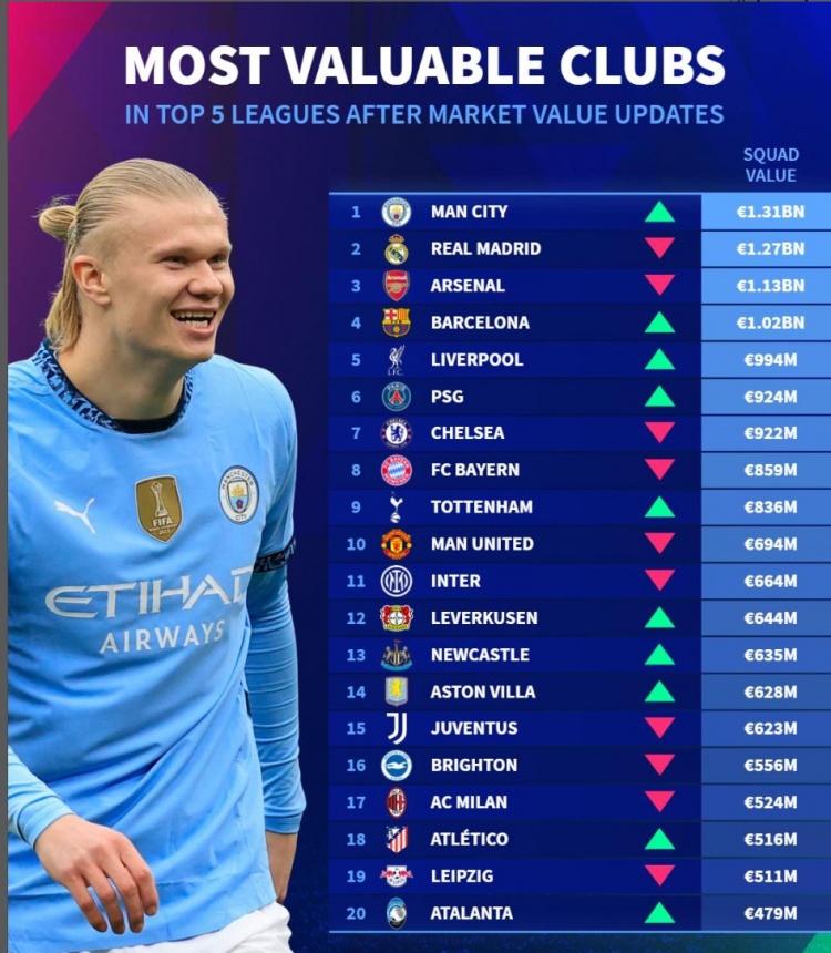3月30日訊 《轉(zhuǎn)會市場》在近日更新了五大聯(lián)賽球員身價,并列出了球隊最新身價榜,共計4隊身價突破10億歐元大關(guān)。