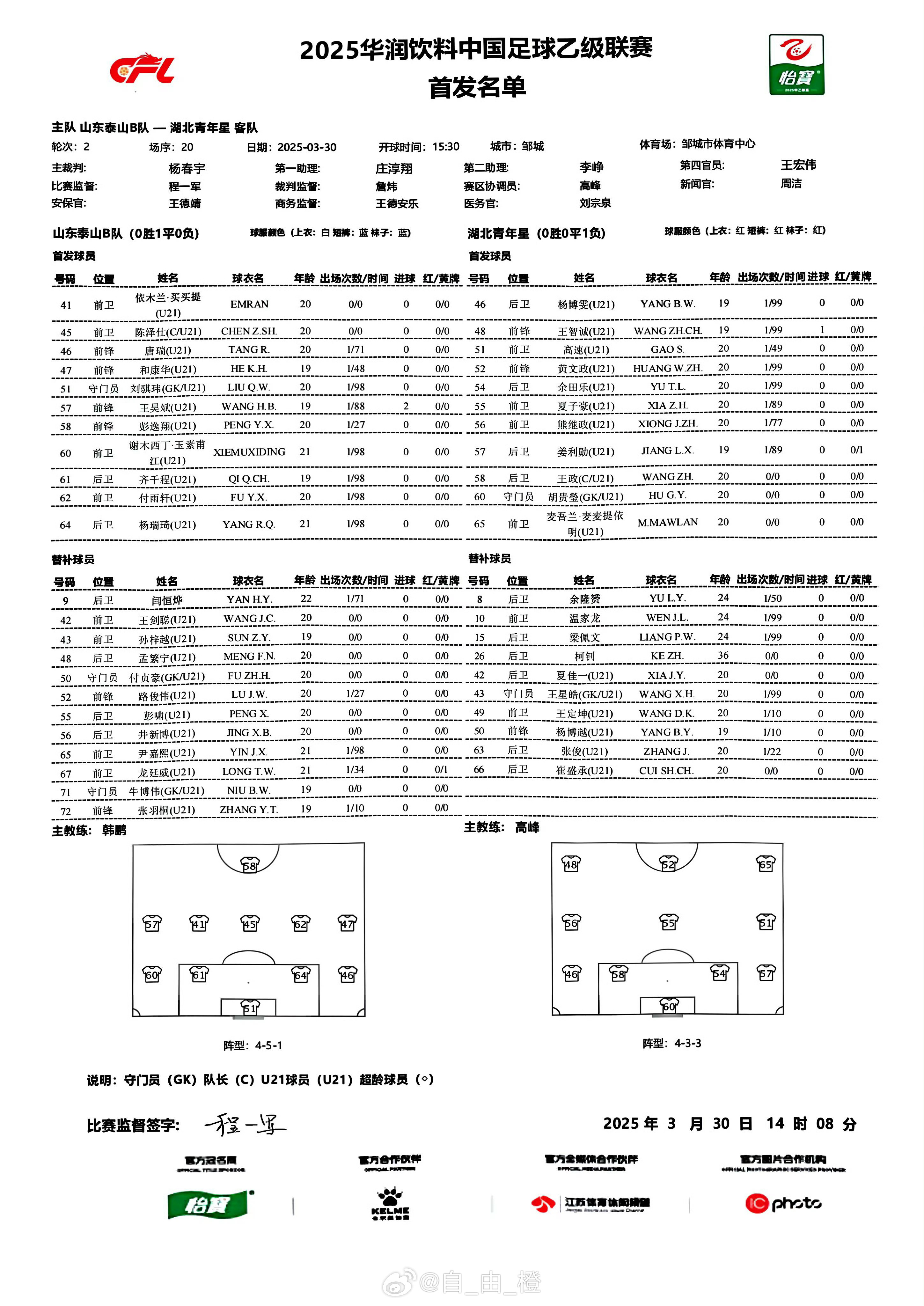 03月30日訊 今日下午進(jìn)行的中乙第2輪比賽,山東泰山B隊(duì)vs湖北青年星,依木蘭、陳澤仕先發(fā),因年齡造假被禁賽3個(gè)月的謝木西丁解禁復(fù)出后繼續(xù)首發(fā)。