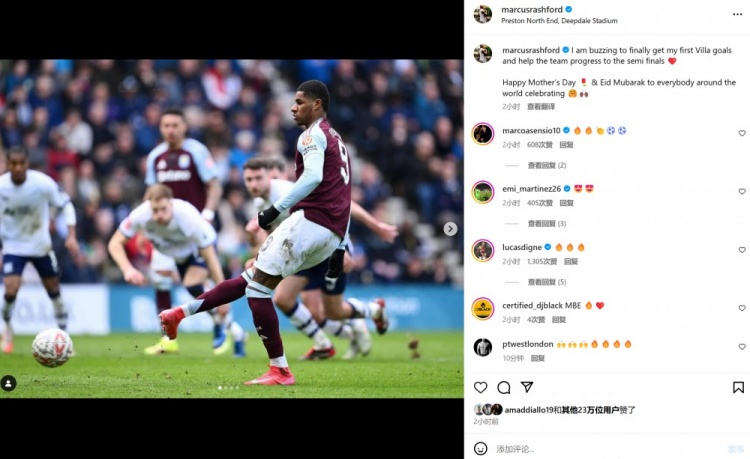 拉什福德賽后也在個人社媒曬出本場照片,配文寫道:“非常激動終于收獲在維拉首粒進球,并且?guī)椭蜿爼x級半決賽。祝大家母親節(jié)&開齋節(jié)快樂?!?/p>