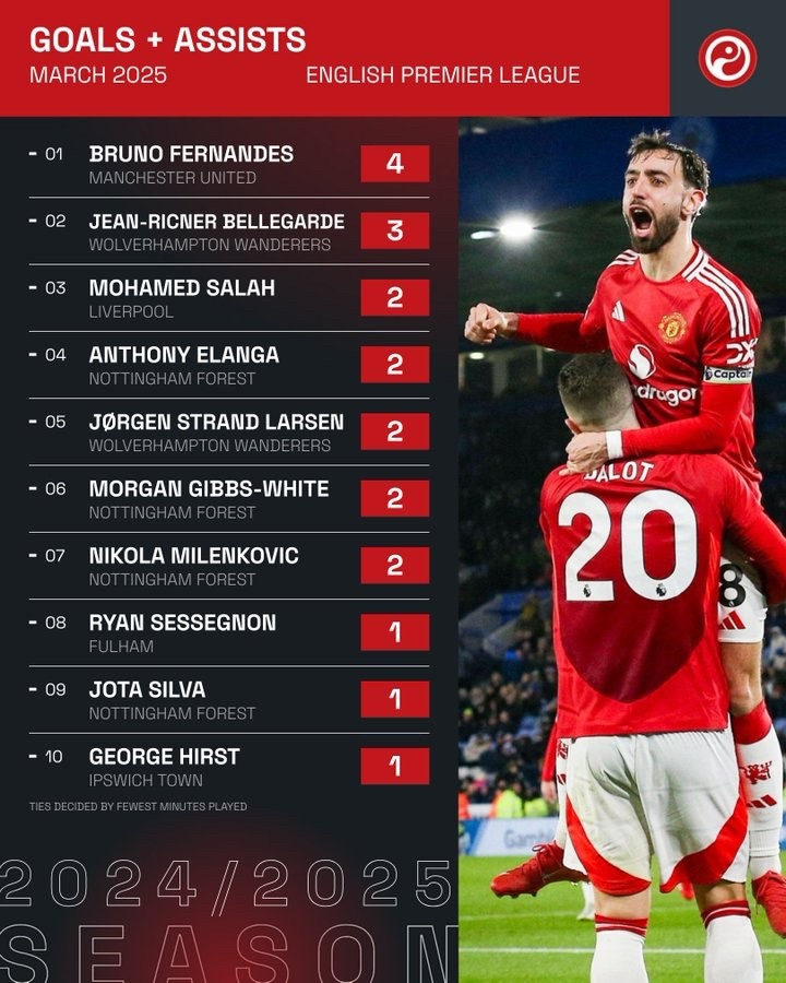 4月1日 據(jù)Squawka統(tǒng)計(jì),B費(fèi)參與了曼聯(lián)在三月份英超聯(lián)賽中所有的4個進(jìn)球,這在英超球員中排在第一位。