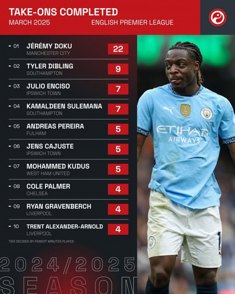 4月1日訊 Squawka統(tǒng)計了英超3月份球員的成功過人數(shù)據(jù),并列出榜單,曼城邊鋒多庫22次斷層居首,迪布林9次第二。值得一提的是,多庫的過人次數(shù)在英超球隊中也能排在第三位,僅次于曼城和南安普頓。