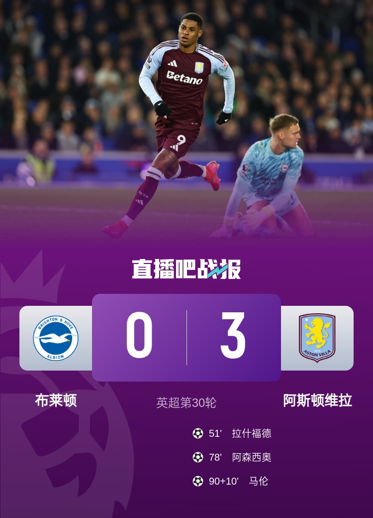 拉什福德、阿森西奧、馬倫破門,維拉3-0布萊頓各賽事六連勝。