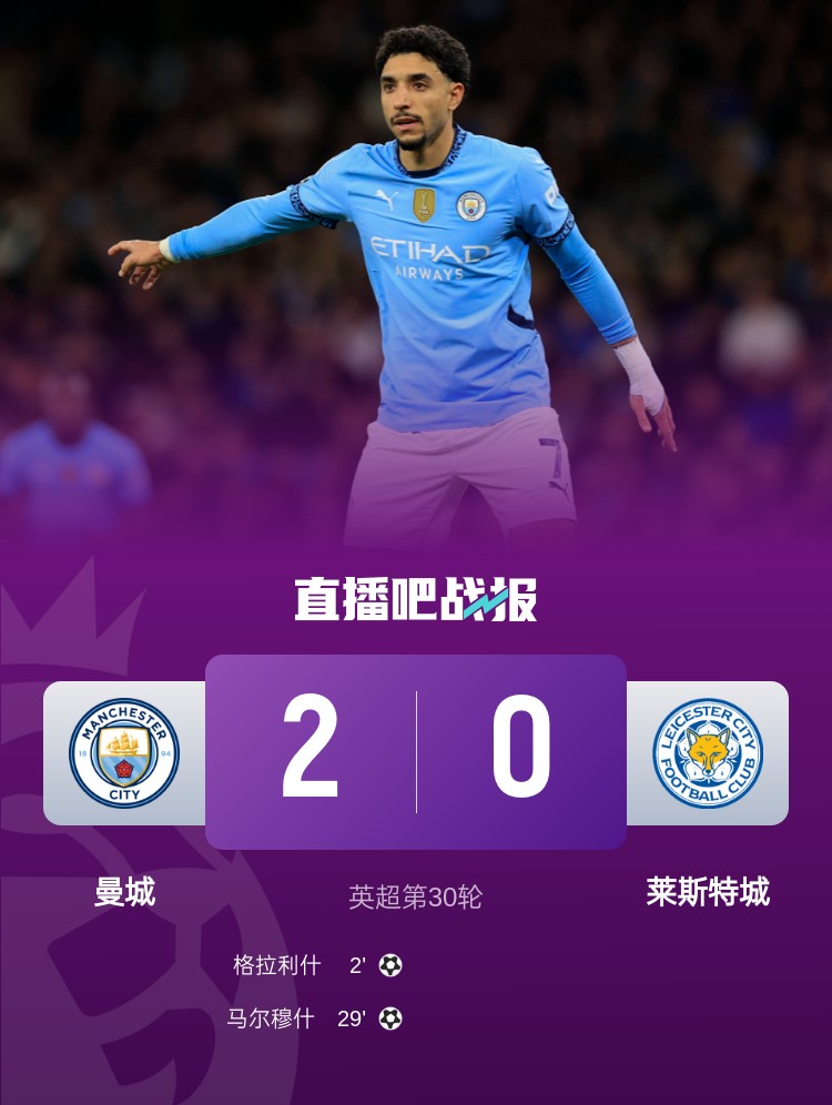 格拉利什閃擊破門,馬爾穆什擴(kuò)大領(lǐng)先優(yōu)勢,曼城2-0擊敗萊斯特城。