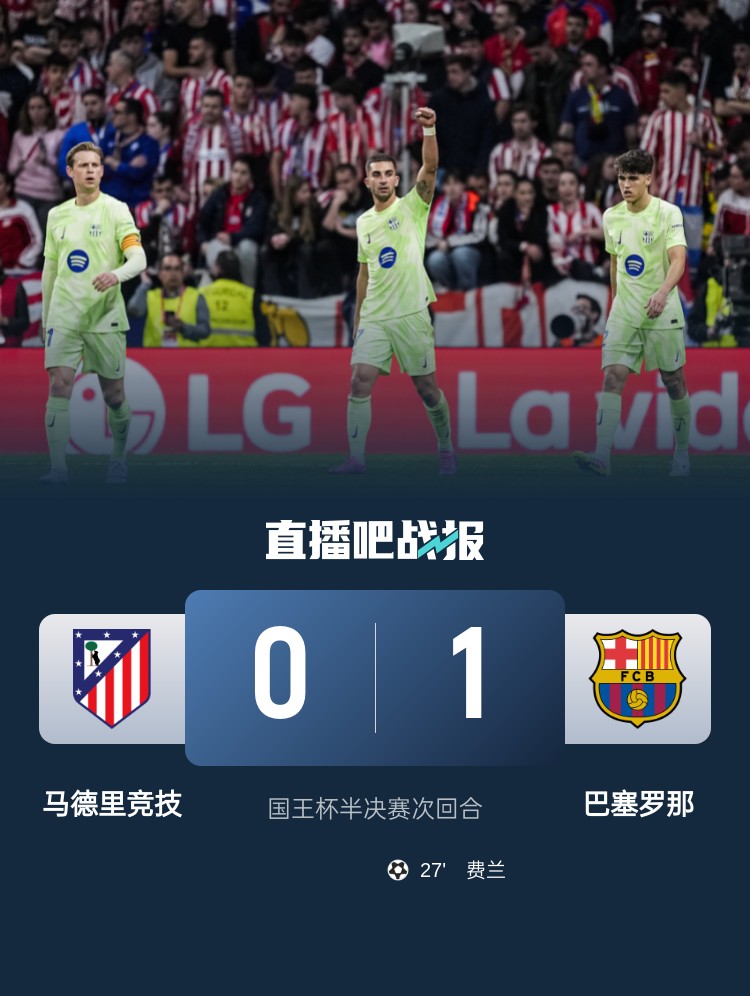 費蘭制勝,巴薩客場1-0戰(zhàn)勝馬競,總比分5-4淘汰馬競進(jìn)軍國王杯決賽,將對陣皇馬。
