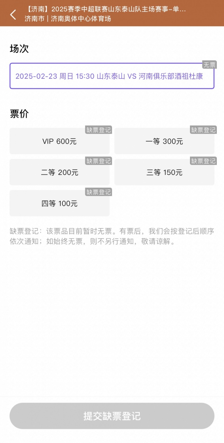 2月22日訊 2月23日下午,中超聯(lián)賽首輪山東泰山將在主場(chǎng)對(duì)陣河南隊(duì)。據(jù)購(gòu)票平臺(tái)顯示,本場(chǎng)比賽球票已售罄。