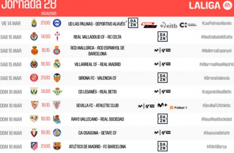 西甲公布聯(lián)賽第28輪比賽時(shí)間:馬競(jìng)vs巴薩強(qiáng)強(qiáng)對(duì)話,皇馬客戰(zhàn)黃潛