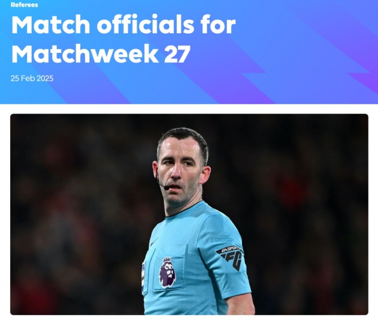 2月25日訊 英超官方公布聯(lián)賽第27輪各場執(zhí)法裁判,賈里德-吉萊特執(zhí)法熱刺vs曼城,克里斯-卡瓦納(上圖)執(zhí)法利物浦vs紐卡,安迪-馬德利執(zhí)法森林vs槍手。