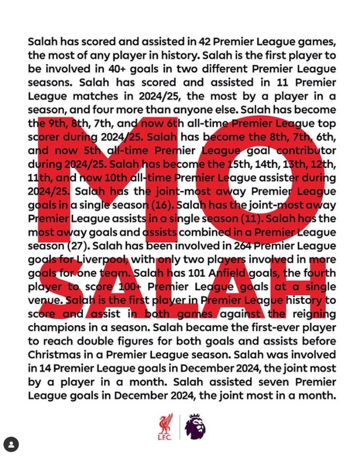 1,薩拉赫在英超一共42次單場傳射,為英超歷史紀錄。