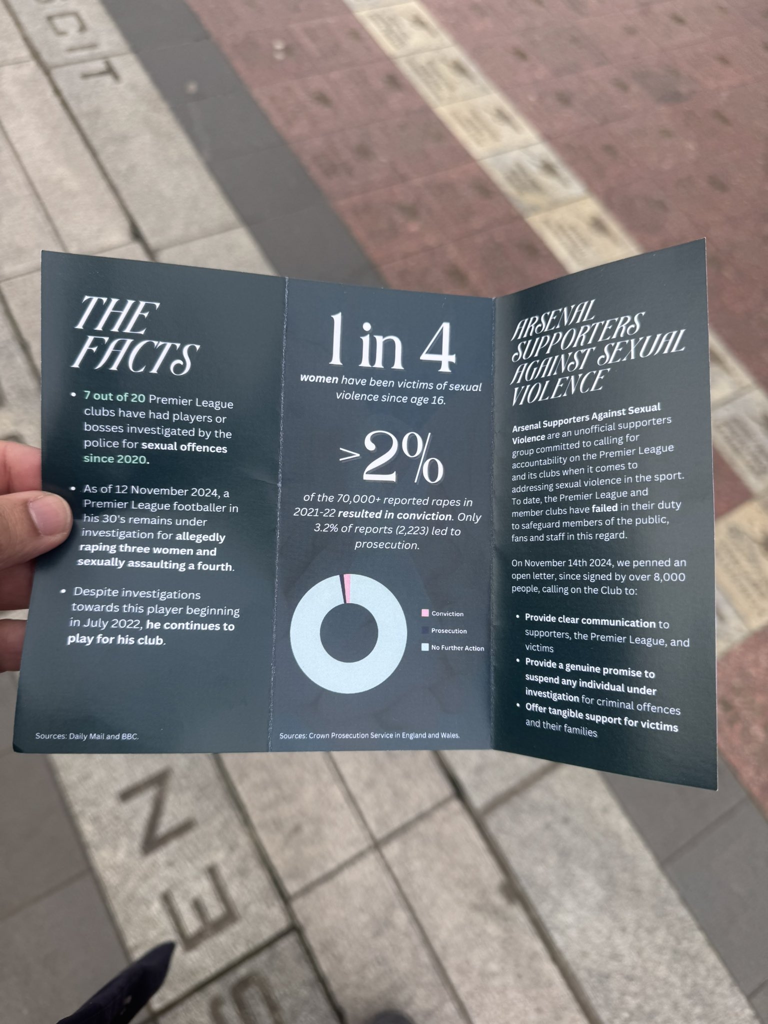 雖然鮑文的進(jìn)球搶走了頭條,但開(kāi)球前在球場(chǎng)外舉行的球迷抗議活動(dòng)也引起了廣泛討論。阿森納球迷反性暴力組織在酋長(zhǎng)球場(chǎng)外舉著寫(xiě)有 “愛(ài)阿森納,恨強(qiáng)奸犯”的牌子,隨后,人們看到該支持者組織散發(fā)傳單,進(jìn)一步說(shuō)明了他們的主張。
