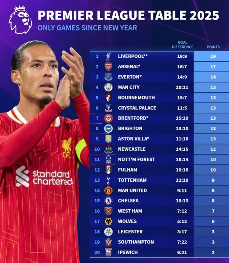 2025英超積分榜: