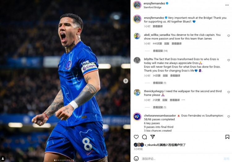 本場比賽恩佐首發(fā)出戰(zhàn)表現(xiàn)出色,貢獻(xiàn)7次關(guān)鍵傳球,賽后恩佐也在個人社媒曬出怒吼慶祝照,配文寫道:“在主場取得一場重要的勝利,感謝大家的支持,藍(lán)軍全員團(tuán)結(jié)一致!”