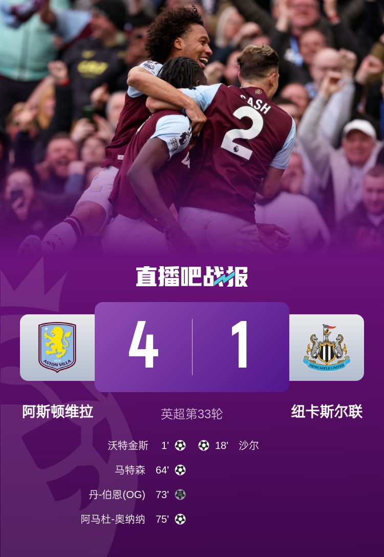 英超聯(lián)賽第33輪,阿斯頓維拉4-1大勝紐卡斯?fàn)柭?lián),沃特金斯傳射,馬特森進球。
