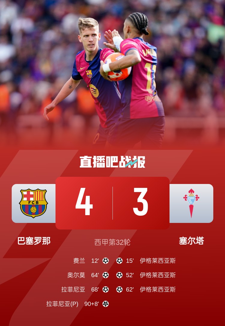 西甲聯(lián)賽第32輪,巴塞羅那連進三球4-3塞爾塔,奧爾莫造點,拉菲尼亞點射絕殺,伊格萊西亞斯帽子戲法。