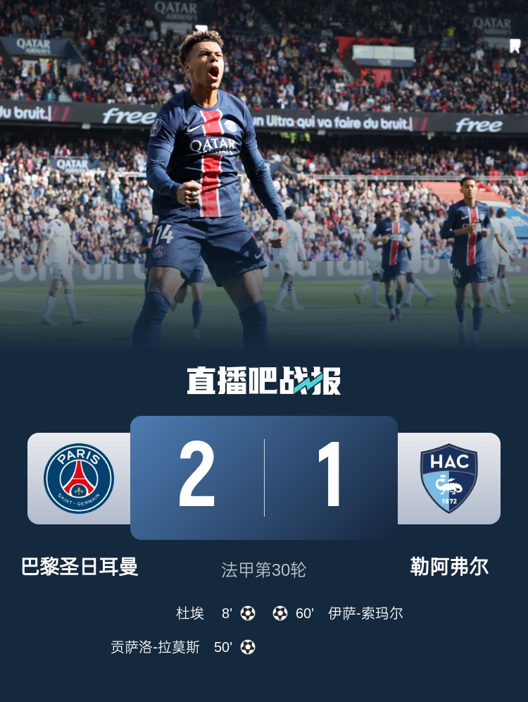 法甲第30輪,巴黎圣日耳曼2-1勒阿弗爾,杜埃、拉莫斯進球。