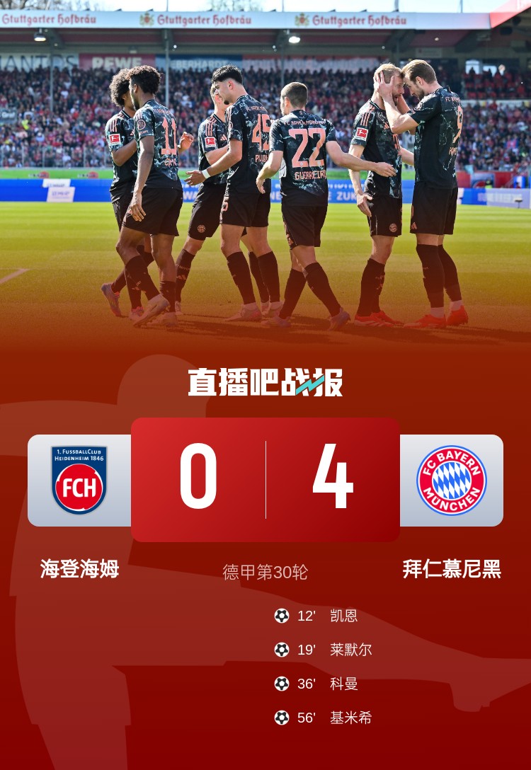 德甲第30輪,拜仁客場4-0大勝海登海姆,凱恩、萊默爾、科曼、基米希進球。