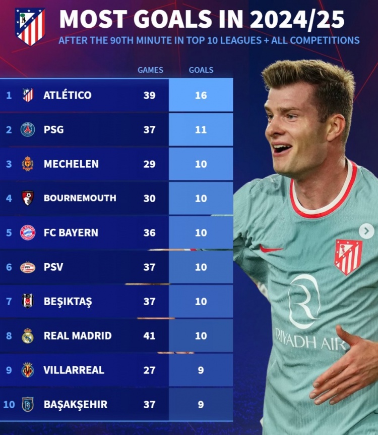 本賽季90分鐘后進(jìn)球榜:馬競(jìng)16球居首,巴黎、拜仁、皇馬在列