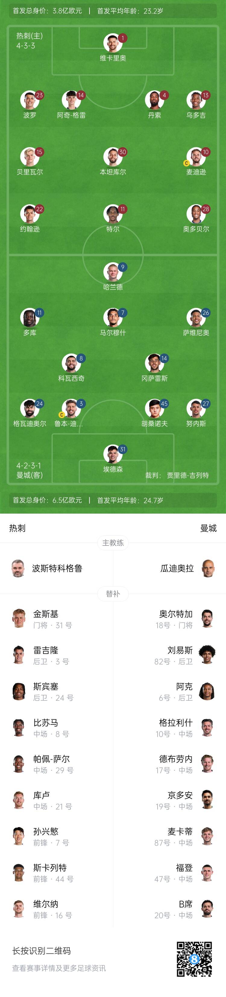 熱刺首發(fā):1-維卡里奧、23-波羅、14-阿奇-格雷、4-丹索、13-烏多吉、30-本坦庫爾、15-貝里瓦爾、10-麥迪遜、22-布倫南-約翰遜、28-奧多貝爾、11-特爾
