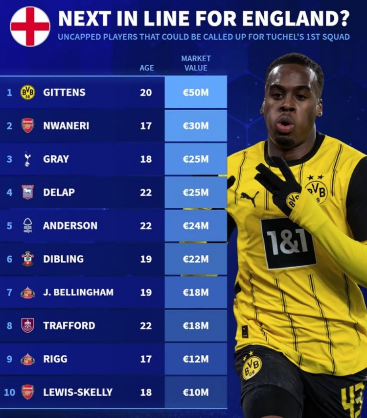 英格蘭仍未被征召最貴身價(jià)榜:歐元