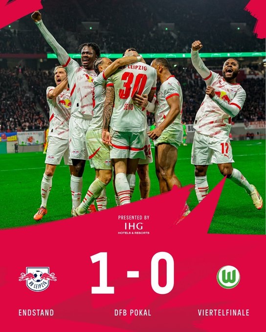 2月27日訊 今天凌晨,萊比錫紅牛在德國杯1/4決賽中1-0小勝沃爾夫斯堡,自此,本賽季德國杯四強球隊出爐。