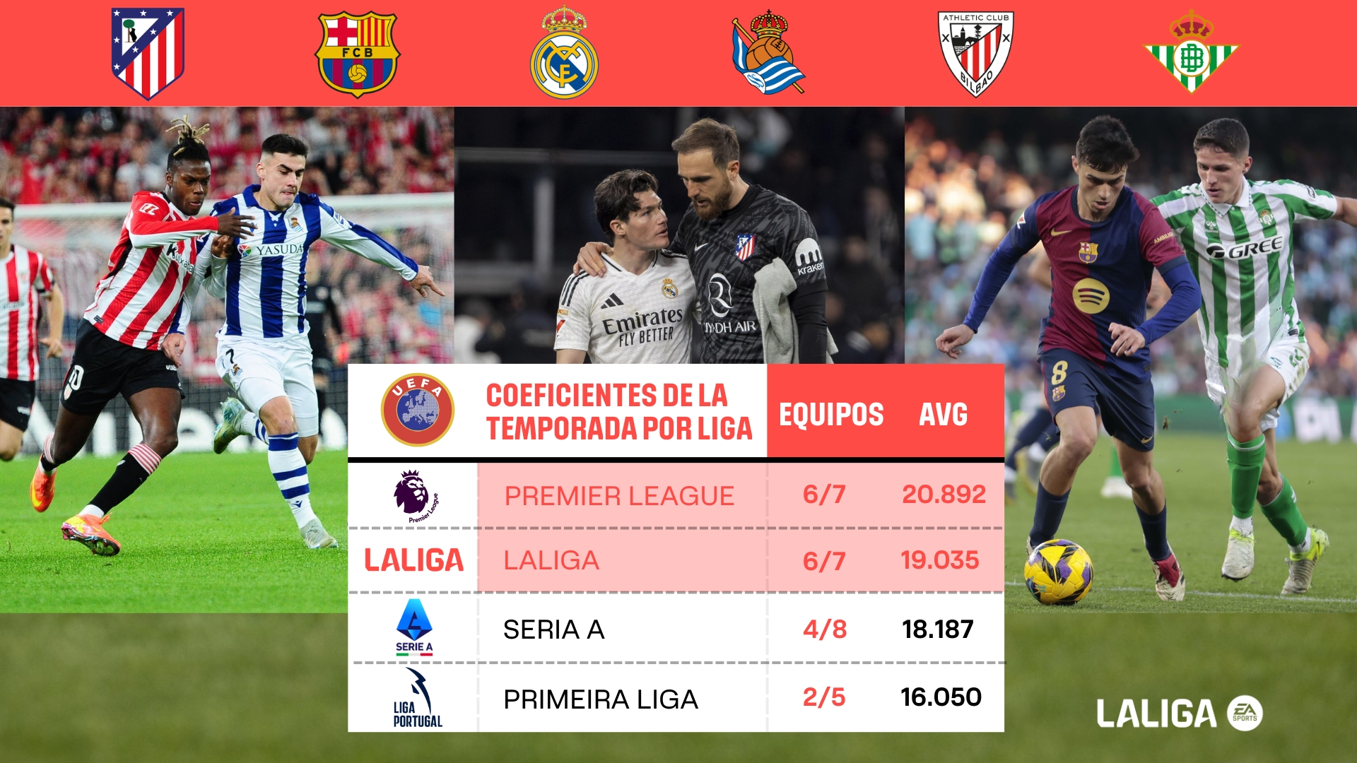 這些西班牙球隊(duì)在歐戰(zhàn)中的出色成績,以及他們在此期間獲得的一些重要勝利,提升了西班牙在歐足聯(lián)官方國家排名中的積分系數(shù)。2024-25賽季,只有英格蘭俱樂部的歐戰(zhàn)積分均分(20.892)高于西班牙俱樂部(18.820)。