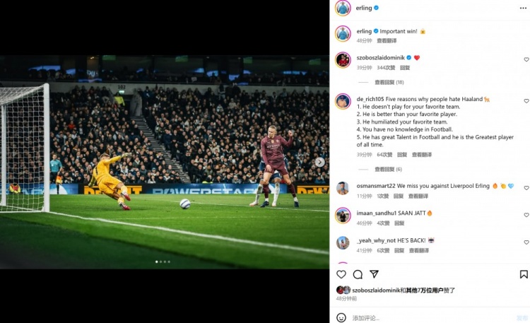 本場比賽哈蘭德打進(jìn)唯一進(jìn)球,賽后他也在個人社媒曬出本場破門瞬間照片,配文寫道:“拿下一場重要的勝利!”