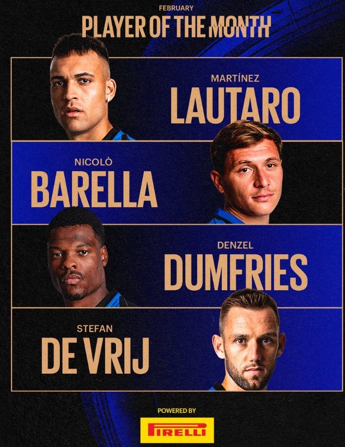 2月27日訊 國米官方評(píng)選出二月份隊(duì)內(nèi)最佳球員候選名單,勞塔羅、巴雷拉等人在列,具體如下: