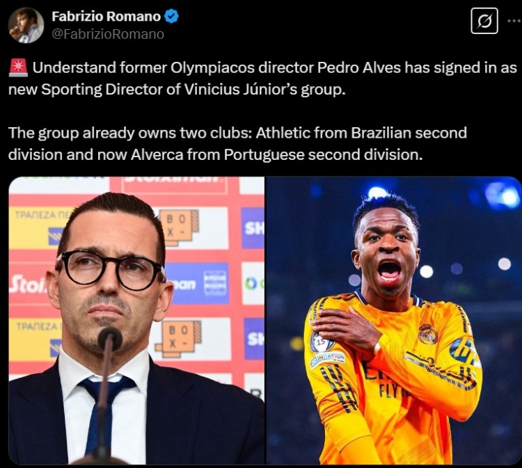 2月27日訊 據(jù)知名轉(zhuǎn)會專家羅馬諾報道,前奧林匹亞科斯隊總監(jiān)佩德羅-阿爾維斯已經(jīng)與維尼修斯團隊簽約,出任團隊的體育總監(jiān)。
