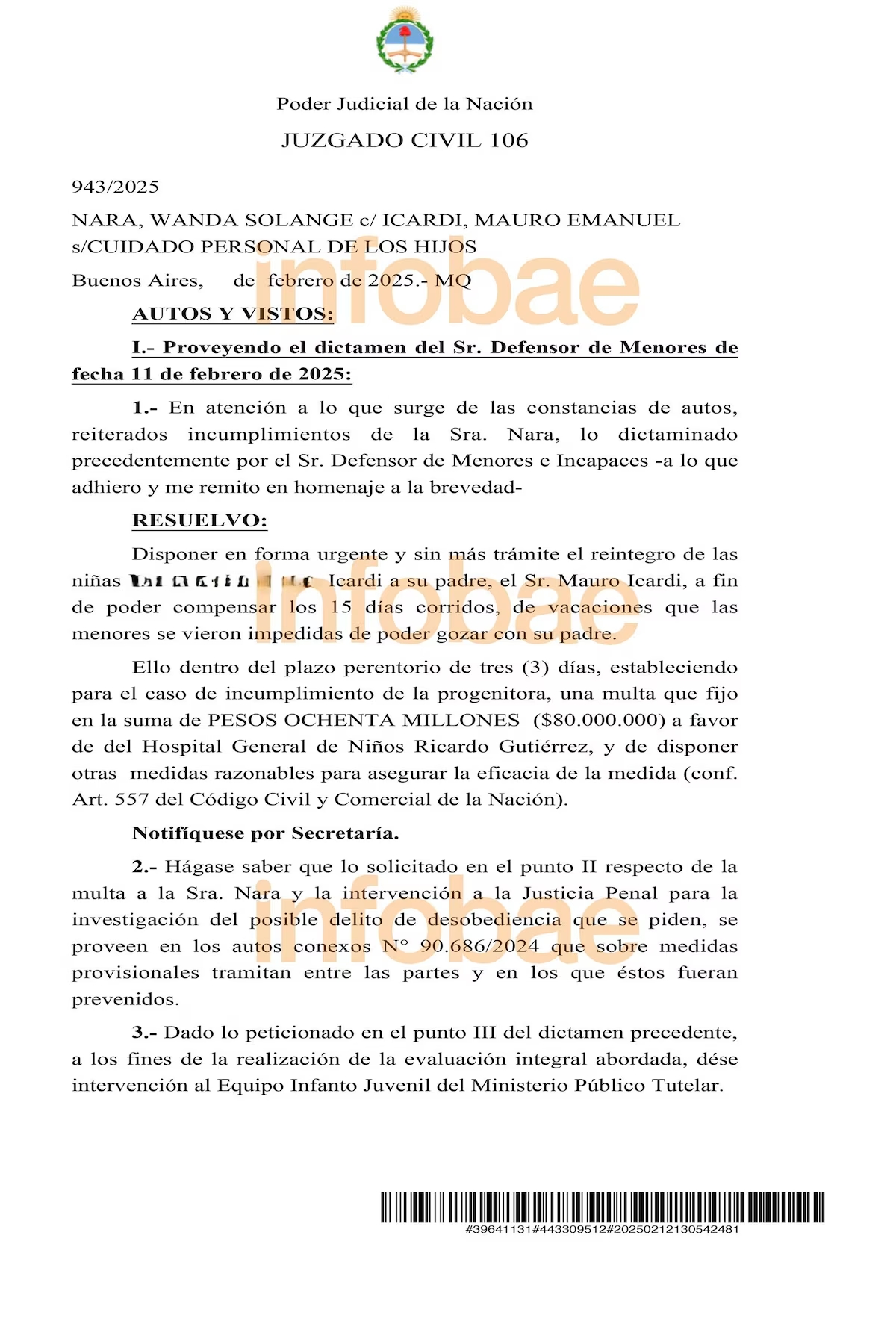 “若母親未在三天內(nèi)履行義務(wù),將對其處以8000萬比索(約合人民幣55.2萬元)罰款,款項捐贈至里卡多-古鐵雷斯兒童醫(yī)院?!?/p>