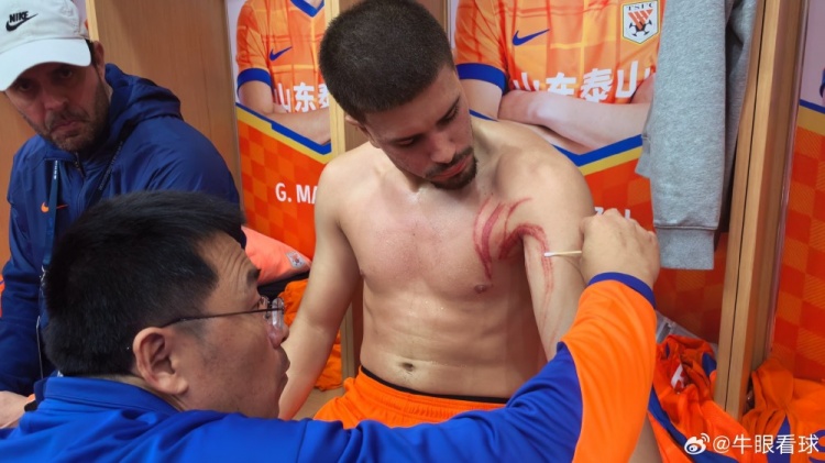 記者牛志明賽后曬出卡扎爾在休息室處理傷情的照片,卡扎爾左側(cè)的肩胛及上臂處有多條血痕,球隊(duì)的工作人員正在為他擦拭傷處。