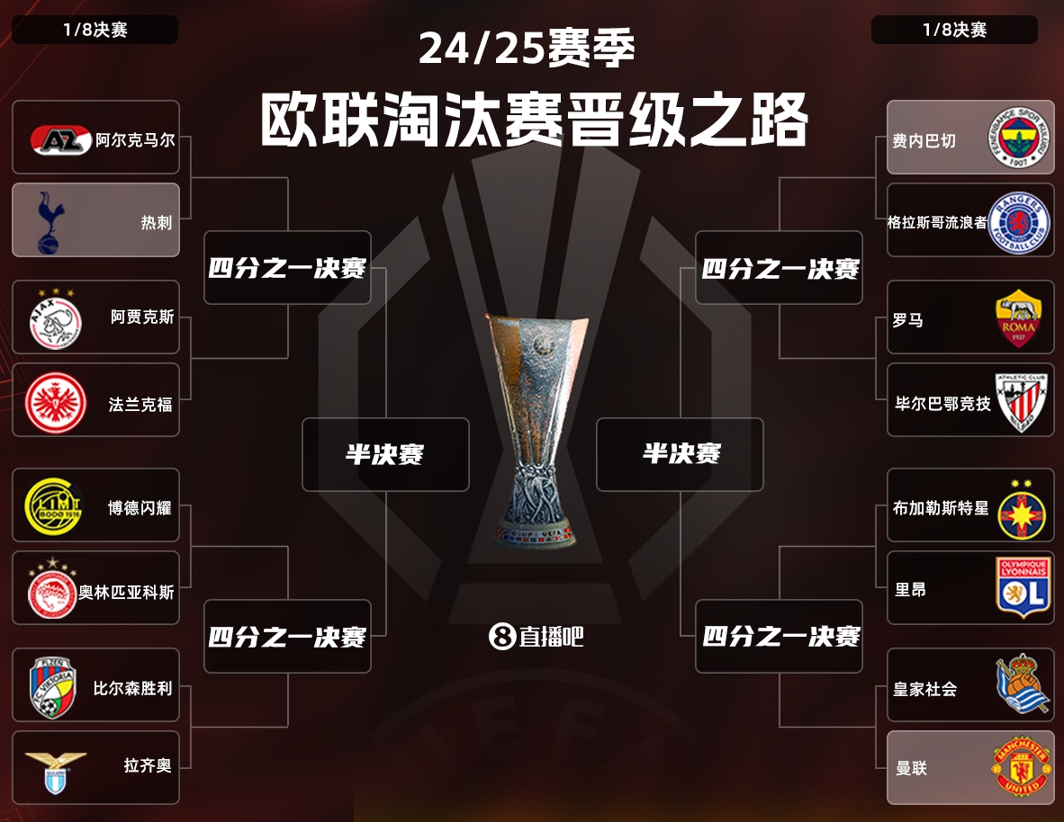 歐聯(lián)1/8決賽對陣:曼聯(lián)vs皇社 熱刺vs阿爾克馬爾 費(fèi)內(nèi)巴切vs流浪者