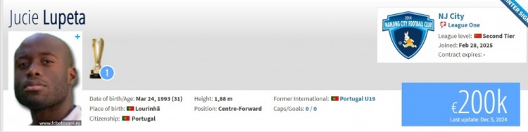 根據(jù)德轉(zhuǎn)信息,盧佩塔以自由轉(zhuǎn)會(huì)的方式加盟南京城市,他目前的身價(jià)為20萬(wàn)歐。