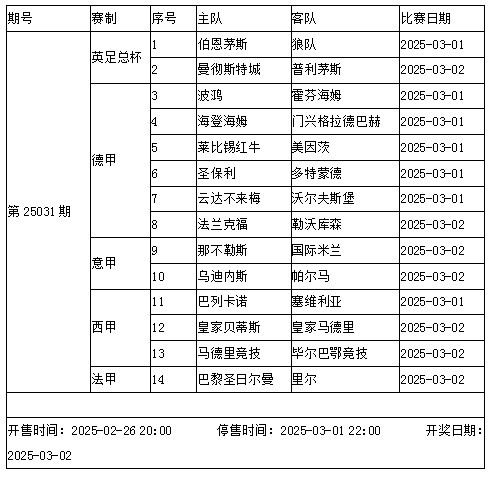 本周末,英超因為足總杯而暫停。下周中又將有歐戰(zhàn)各級賽事淘汰賽,強(qiáng)隊紛紛面臨雙線作戰(zhàn)。傳足勝負(fù)彩第25031期涉及的球隊中,多特蒙德、勒沃庫森、皇家馬德里、巴塞羅那、巴黎圣日爾曼和里爾都要征戰(zhàn)歐冠淘汰賽;法蘭克福、畢爾巴鄂競技征戰(zhàn)歐聯(lián)淘汰賽;皇家貝蒂斯將出戰(zhàn)歐協(xié)淘汰賽。