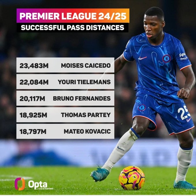 凱塞多成功傳球距離23483米,本賽季英超中場球員最多