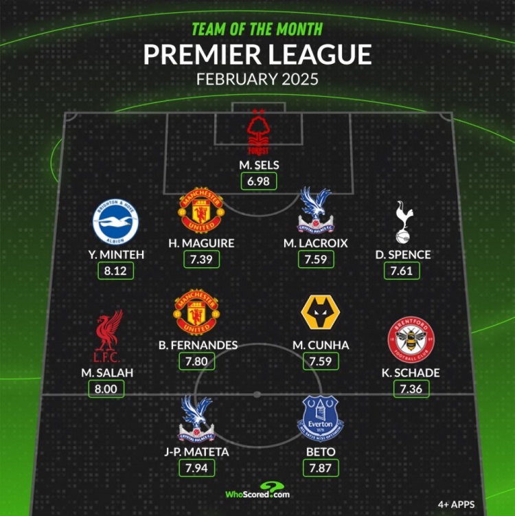 3月1日訊 英超2月比賽已經(jīng)完賽,whoscored也統(tǒng)計(jì)了本月評(píng)分最佳陣容,水晶宮和曼聯(lián)各2人入選。