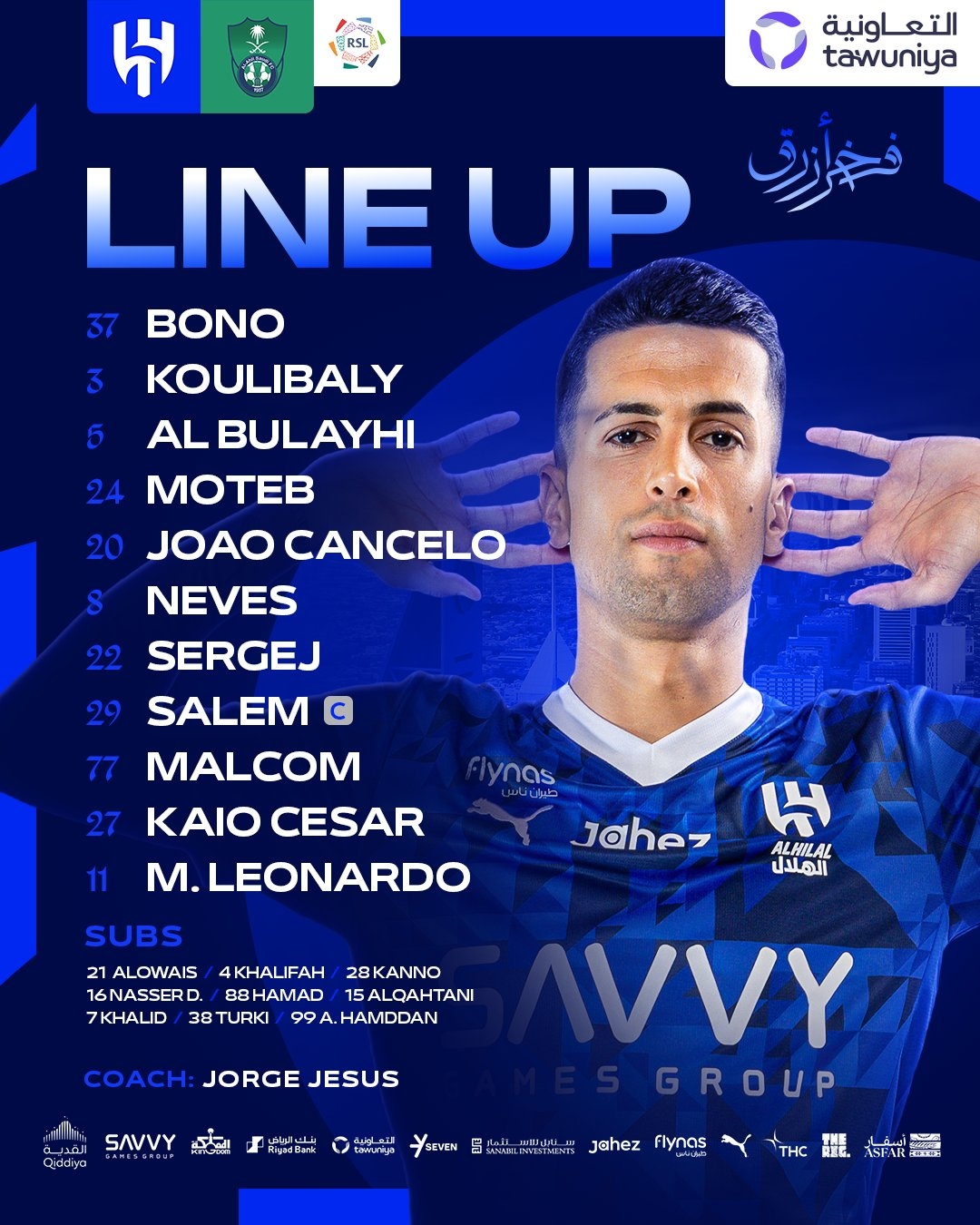 利雅得新月首發(fā):37-布努、3-庫利巴利、5-布萊希、24-穆塔卜-哈爾比、20-坎塞洛、8-魯本-內維斯、22-米林科維奇、29-多薩里、77-馬爾科姆、27-利馬、11-萊昂納多
